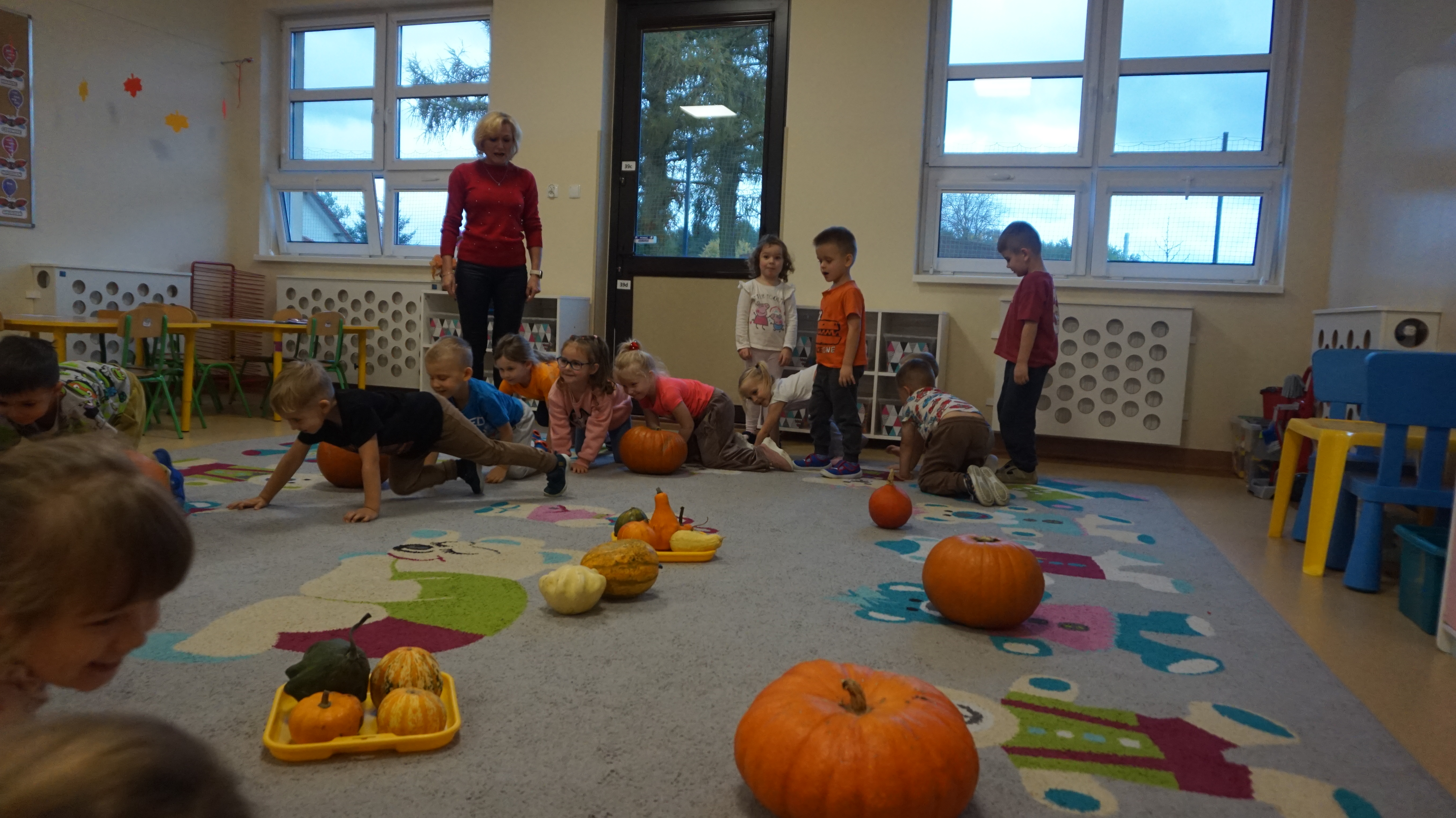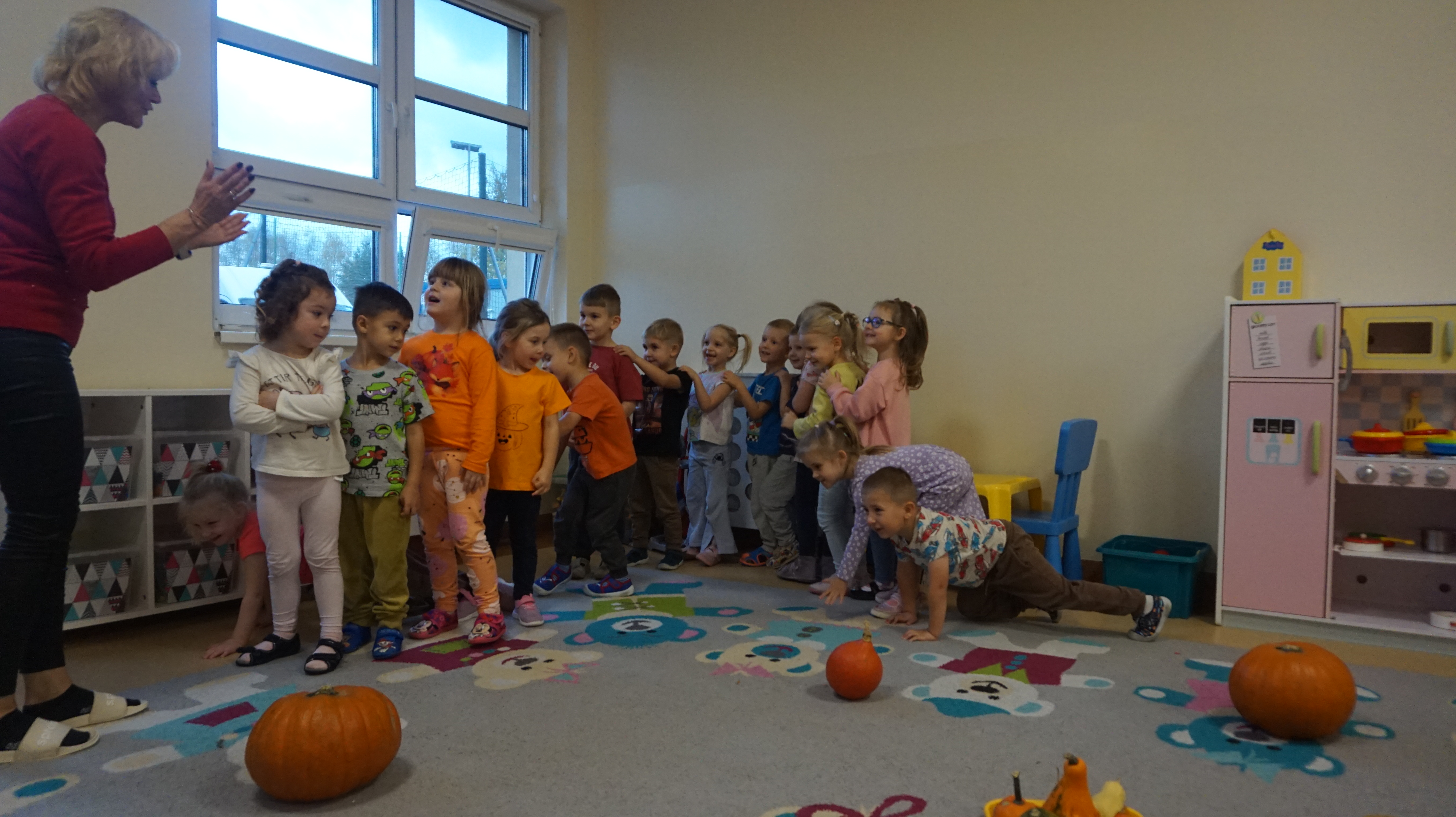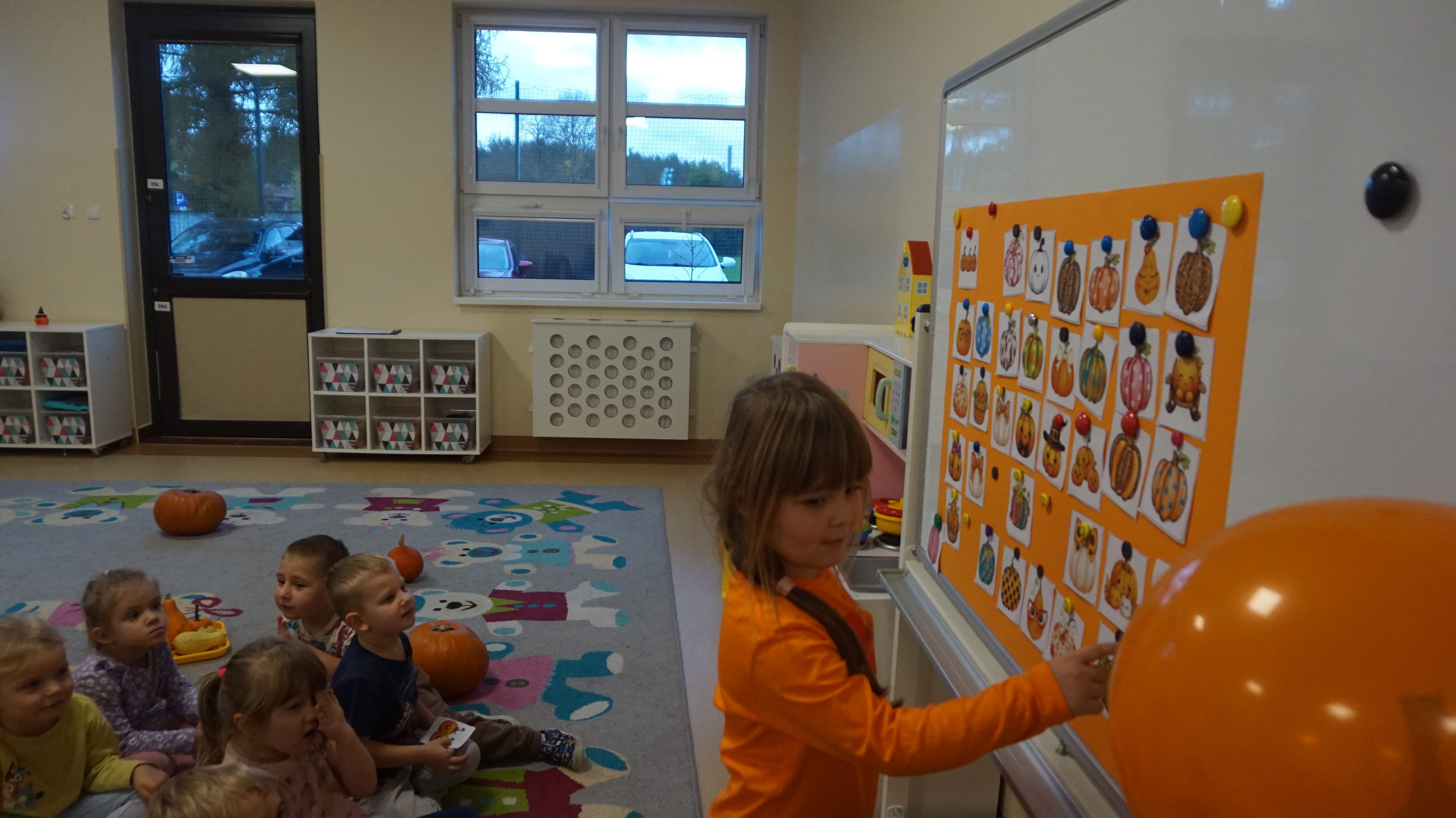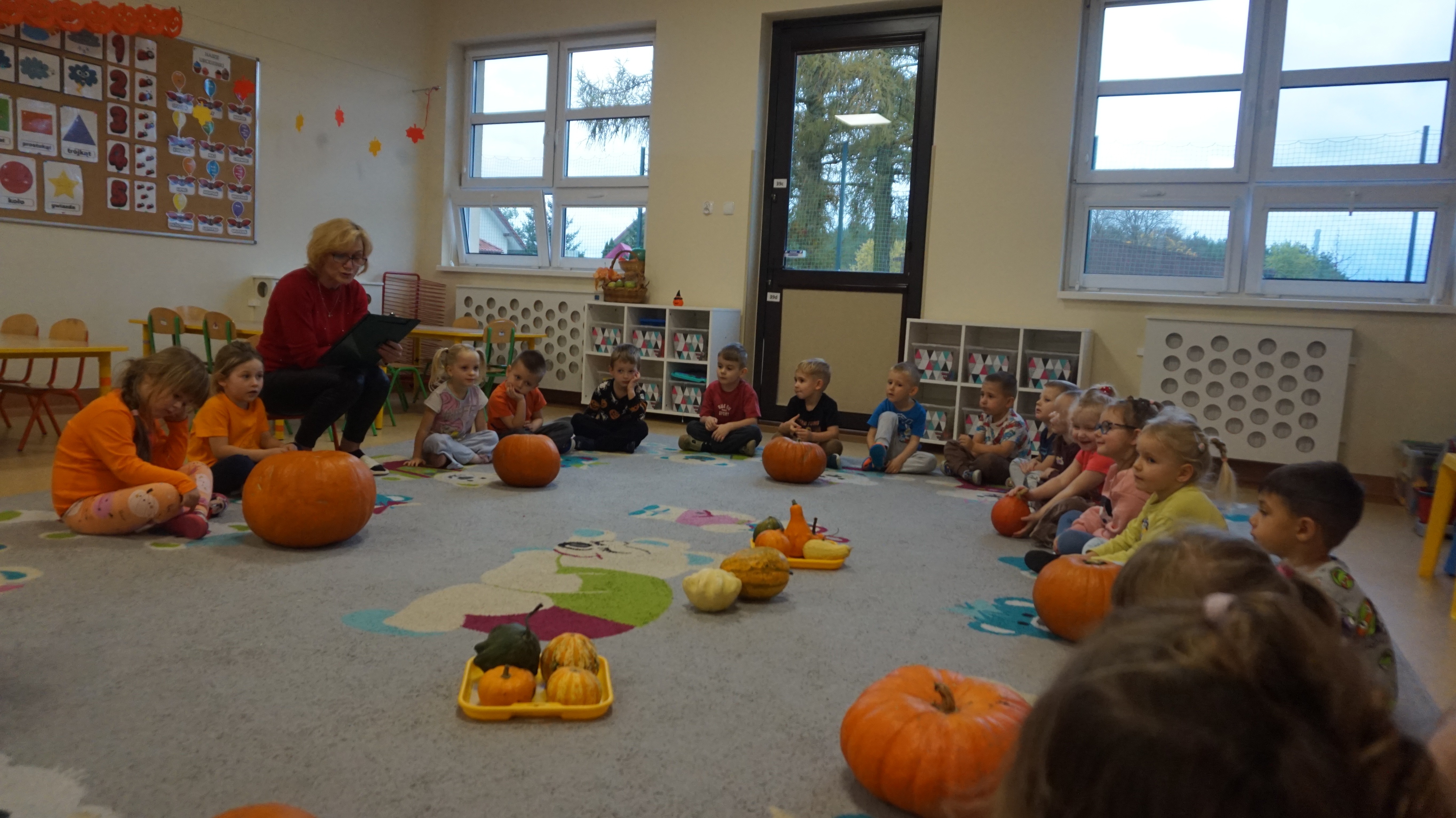W grupie Biedronki odbyły się zajęcia otwarte dla rodziców. Dzieci poznały to dorodne i okazałe warzywo. Wysłuchały bajki o dyni Dorotce, pokonały dyniowy tor przeszkód oraz wyszukiwały dynie według cech.