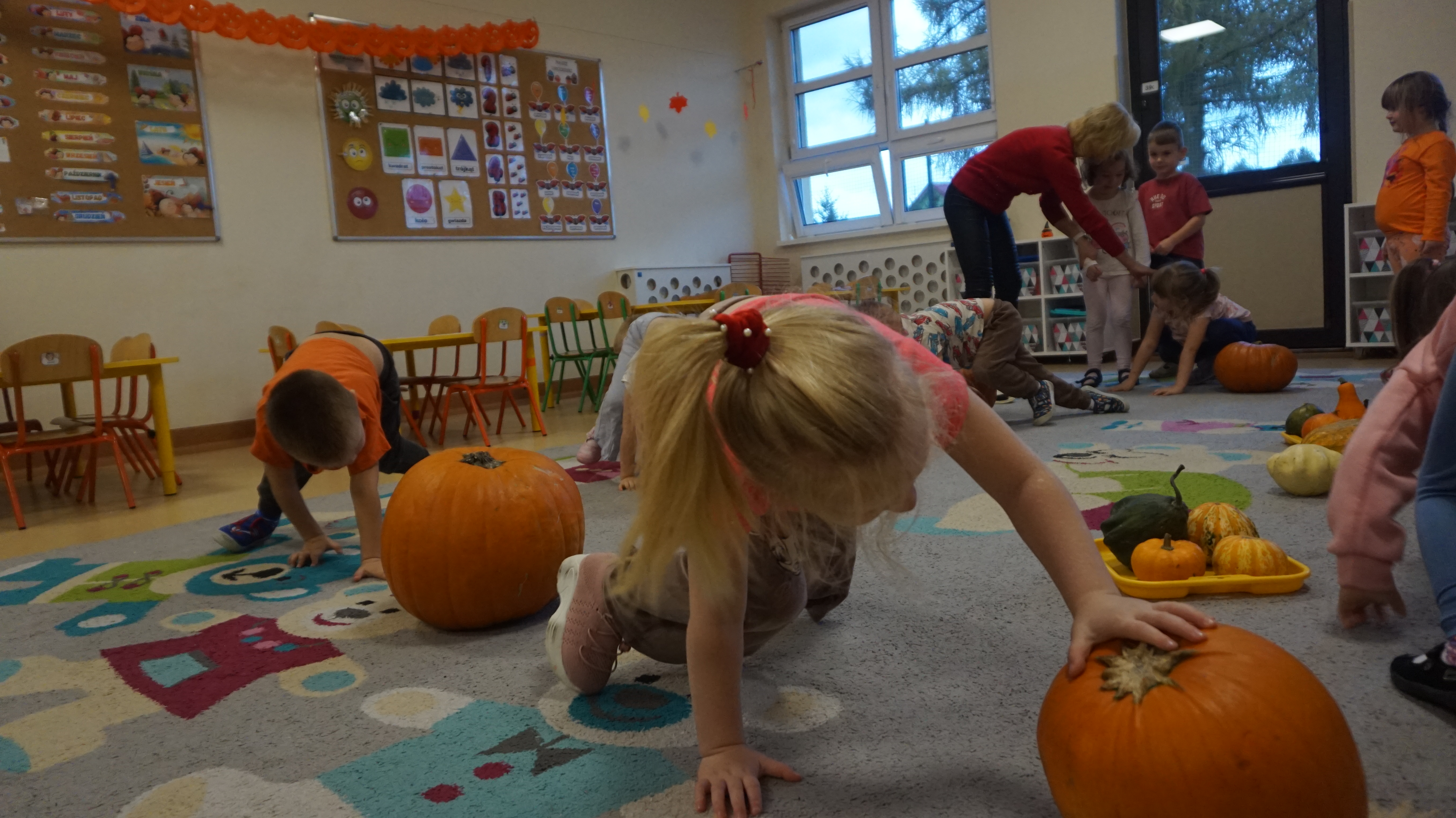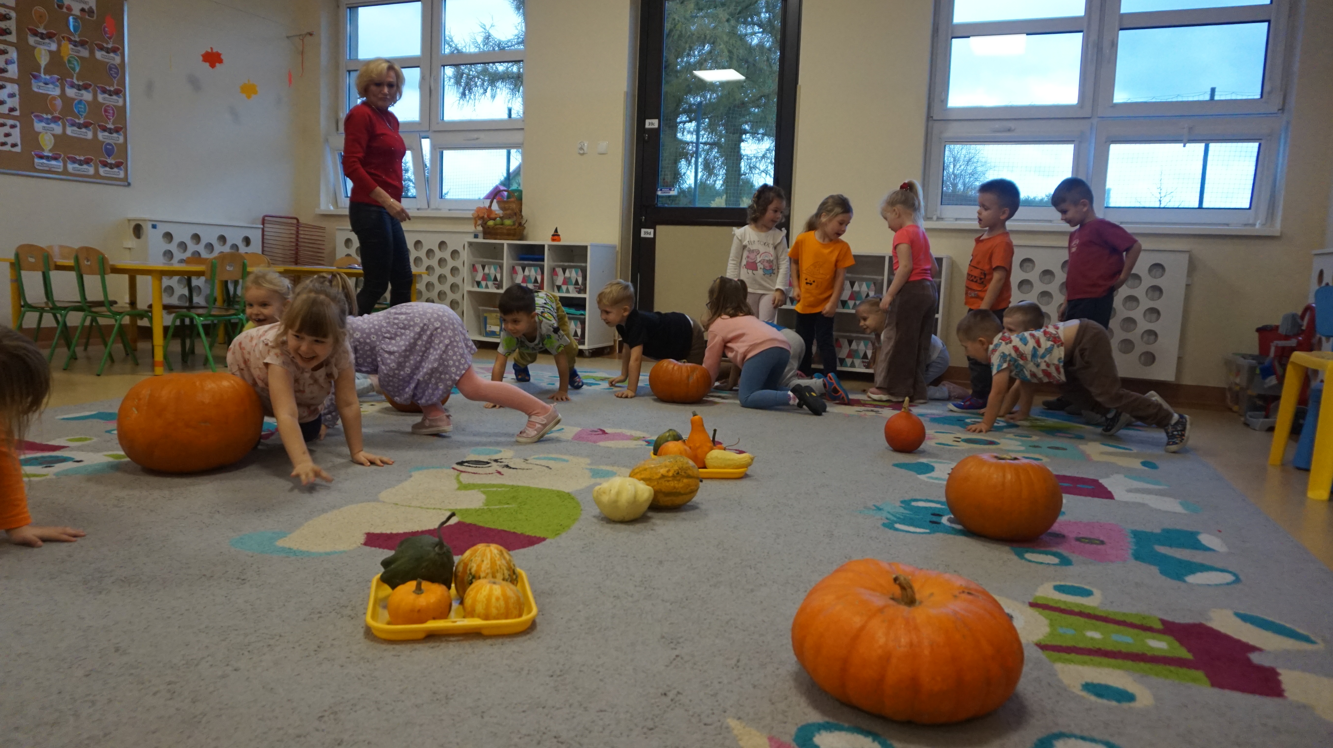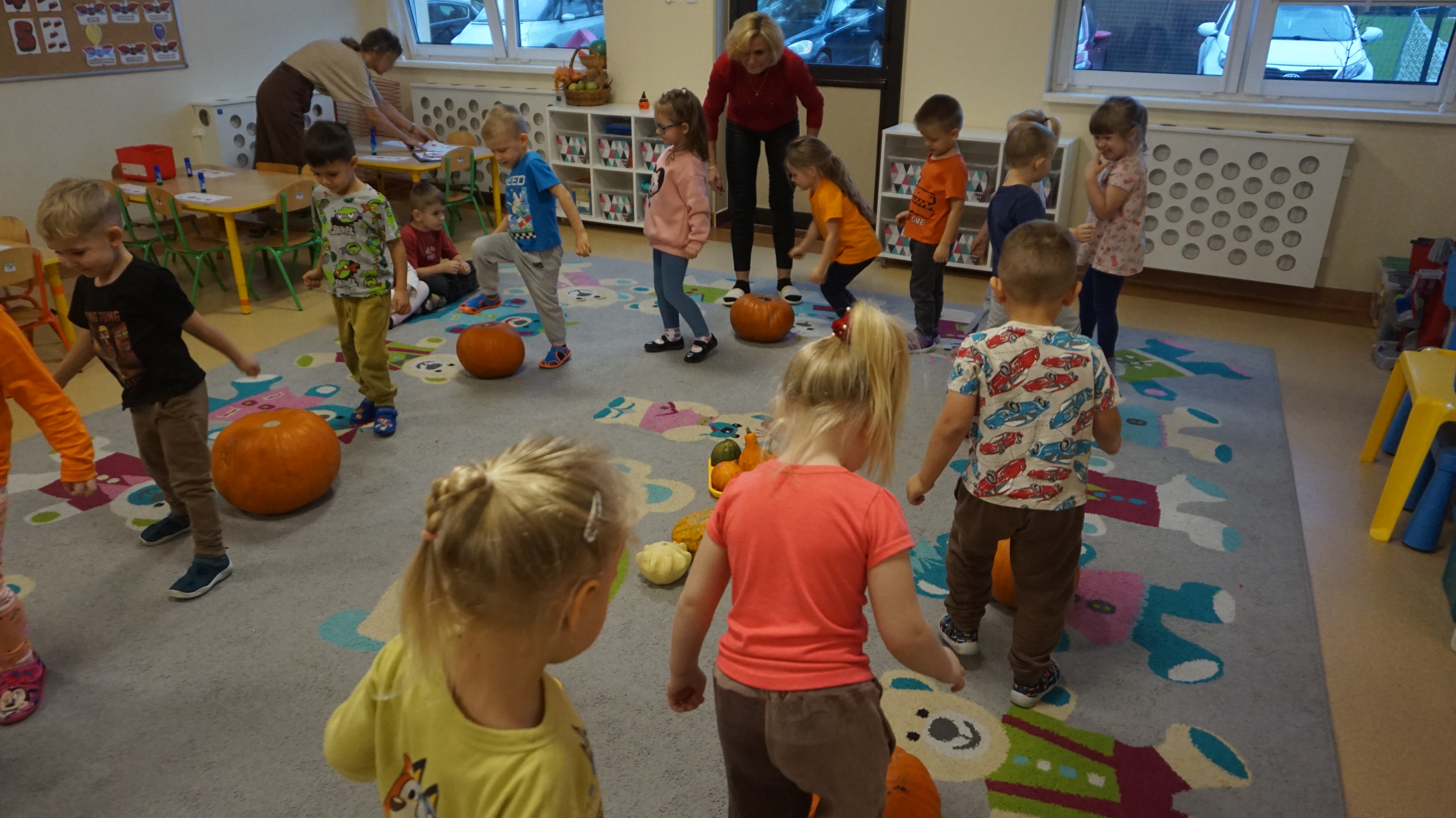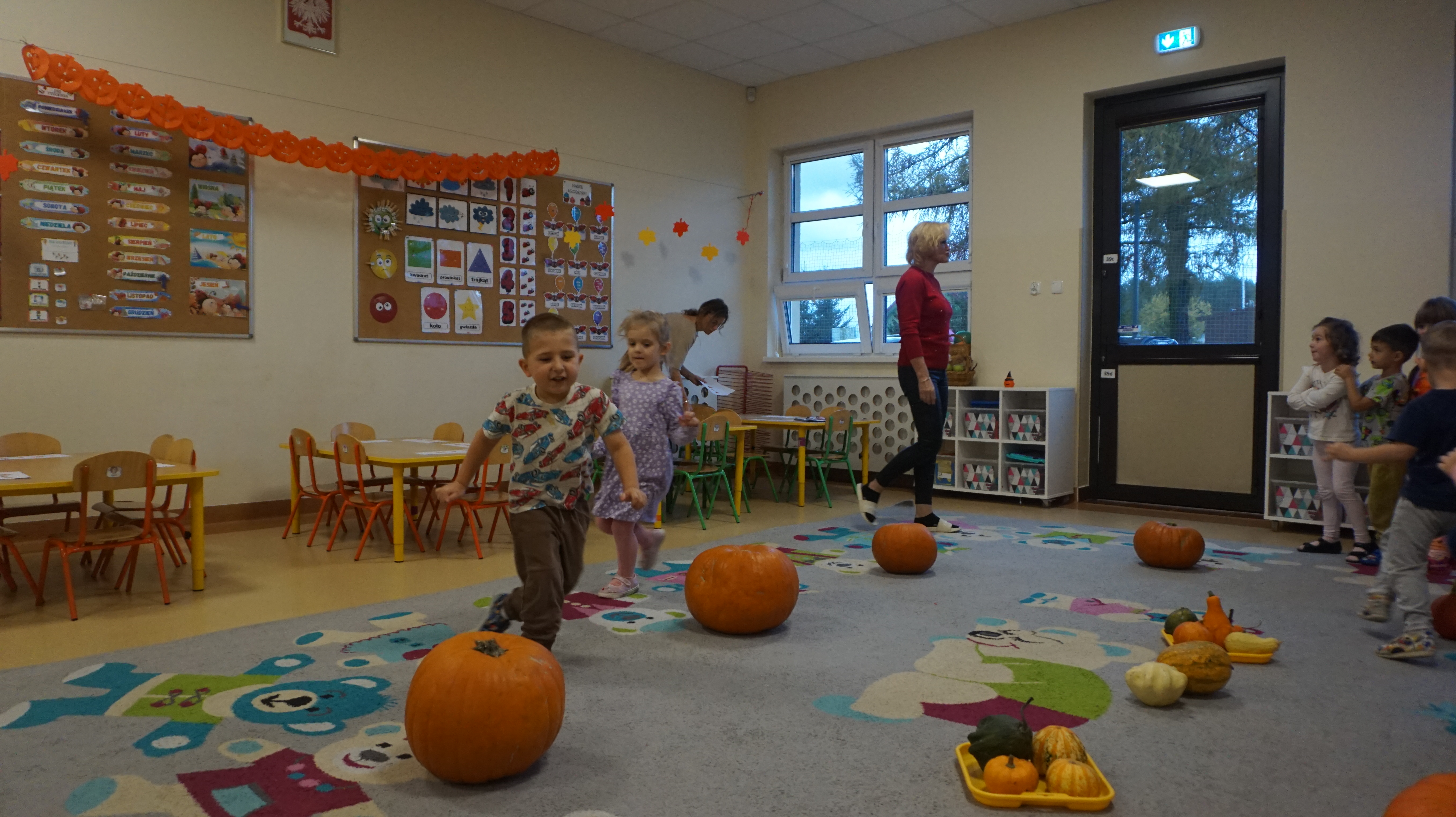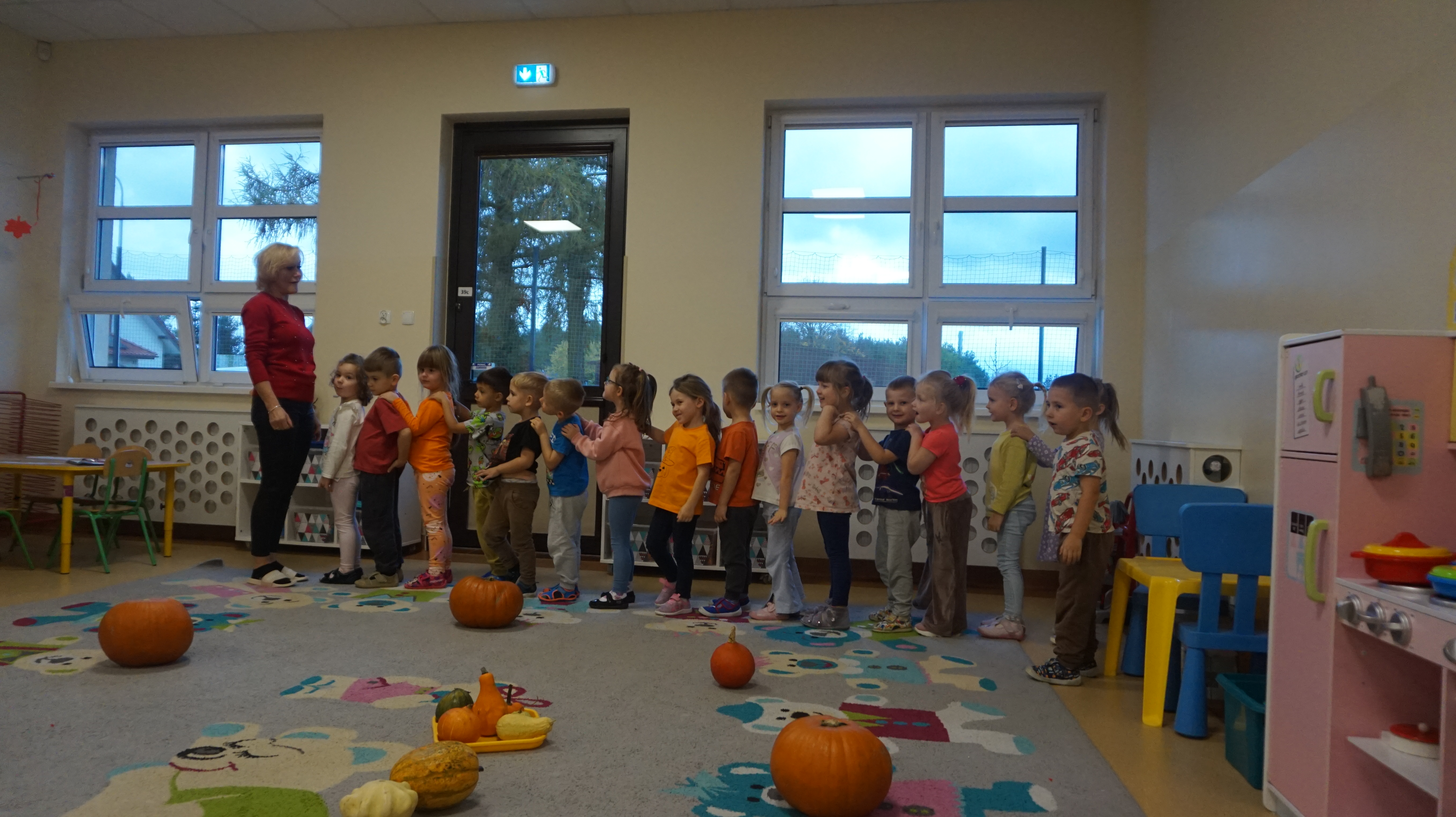 W grupie Biedronki odbyły się zajęcia otwarte dla rodziców. Dzieci poznały to dorodne i okazałe warzywo. Wysłuchały bajki o dyni Dorotce, pokonały dyniowy tor przeszkód oraz wyszukiwały dynie według cech.