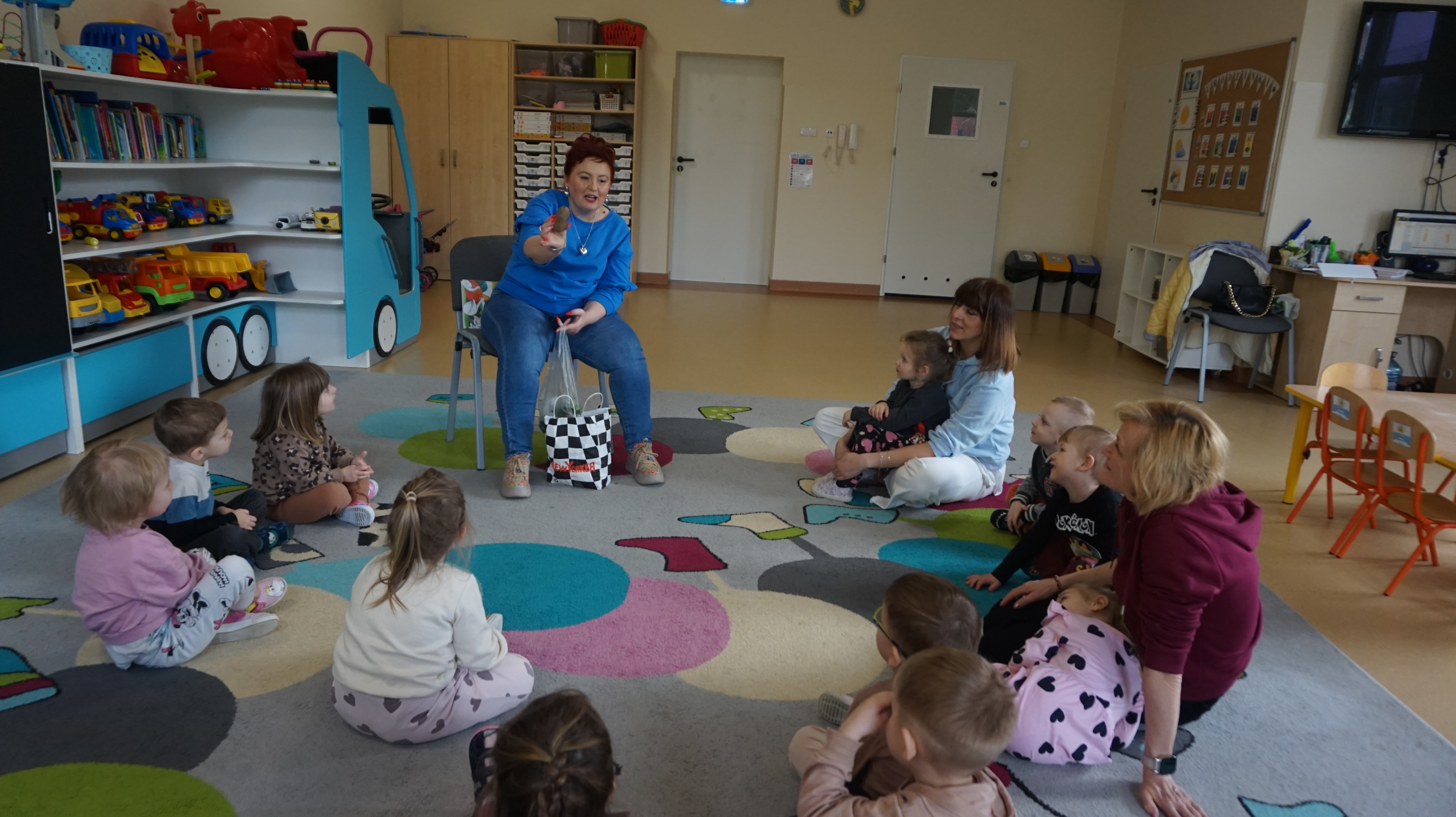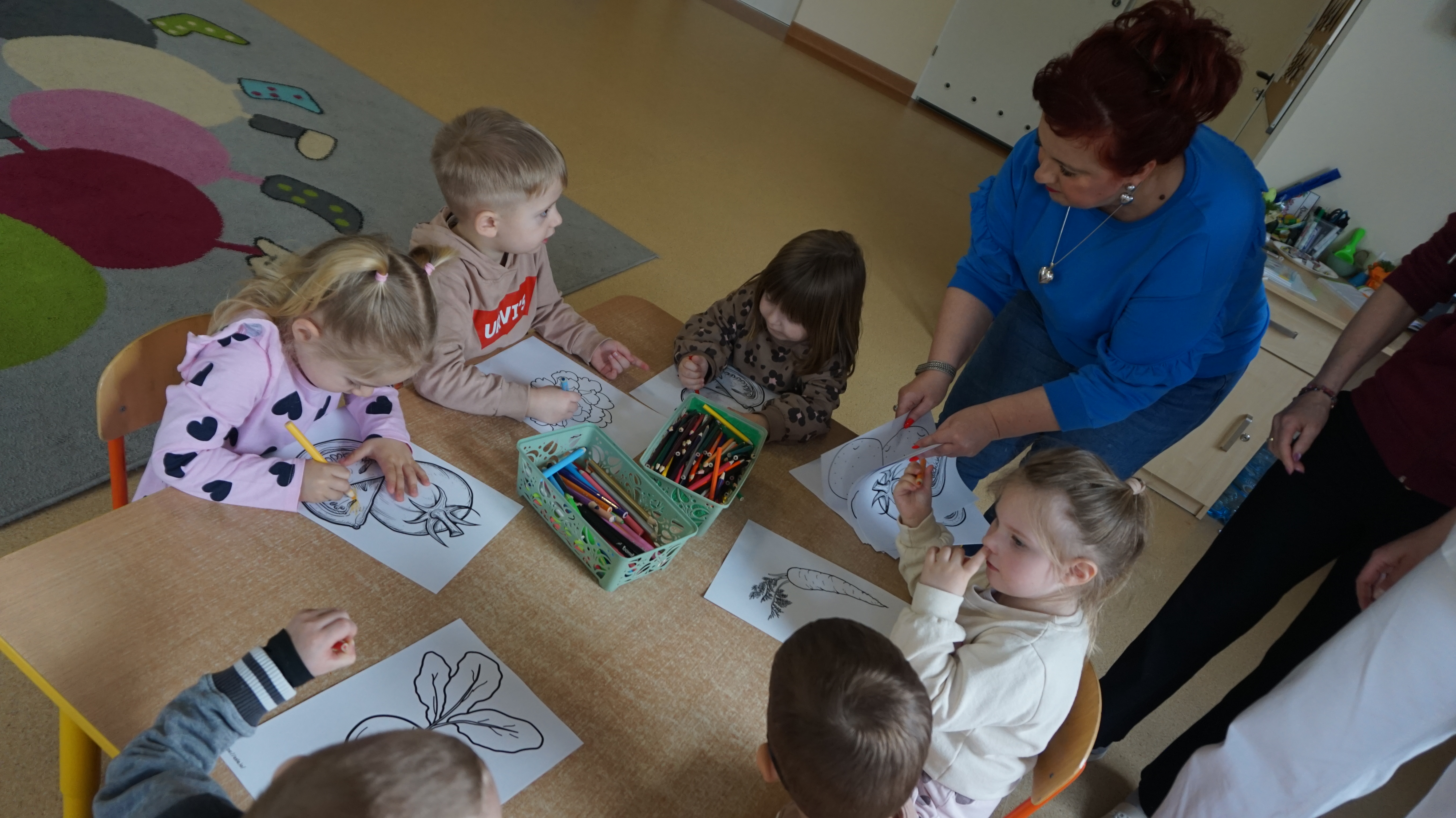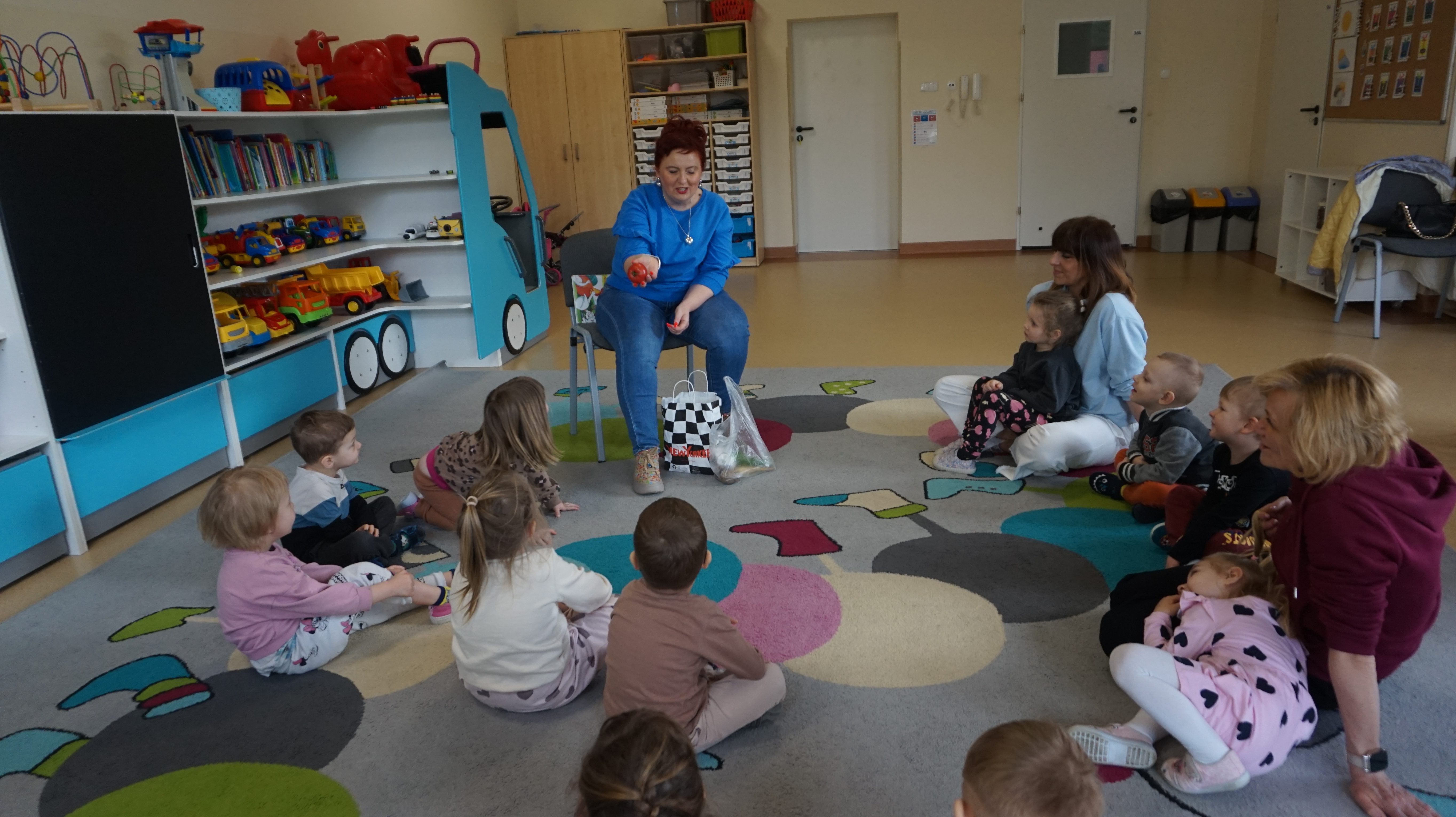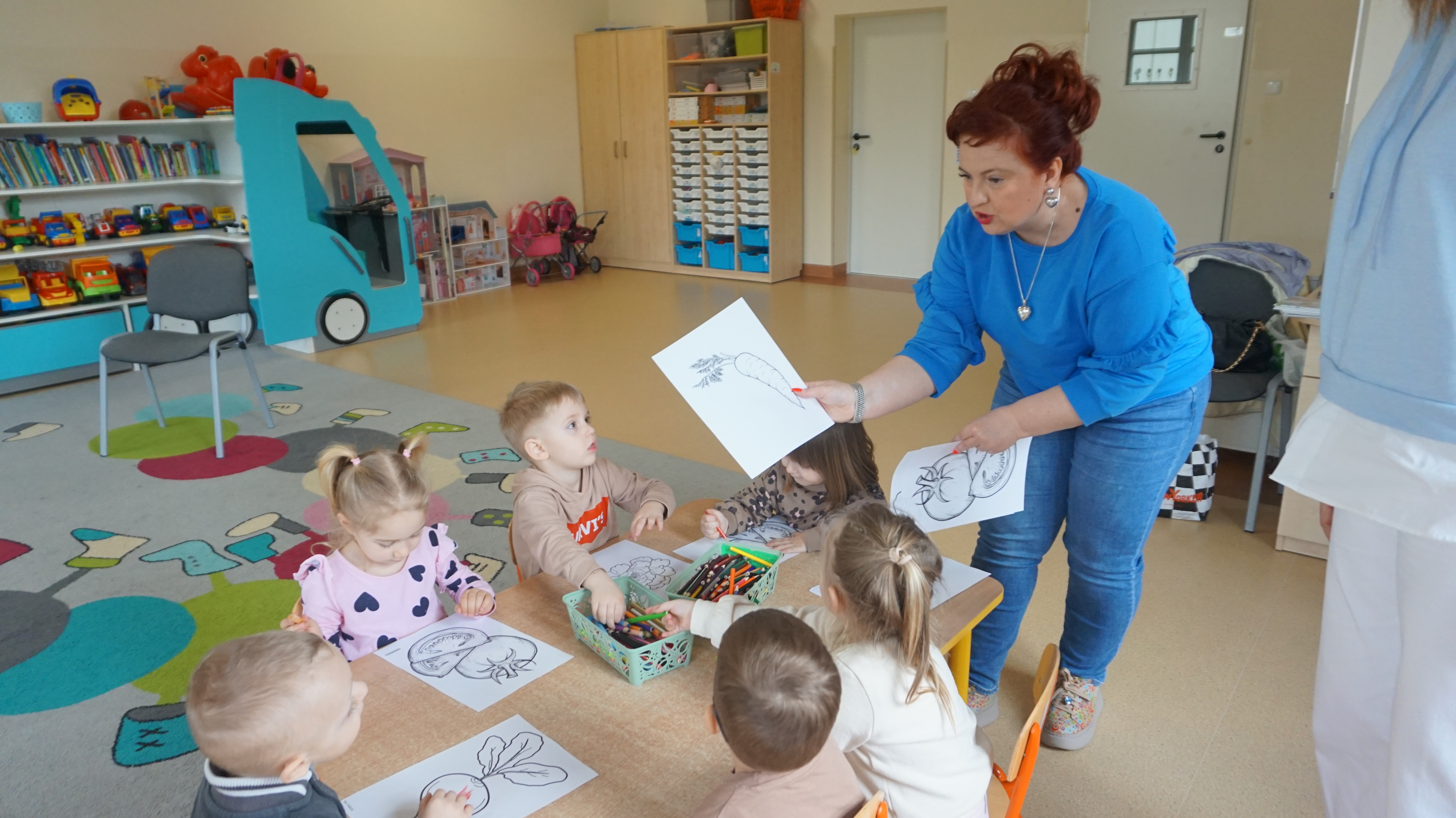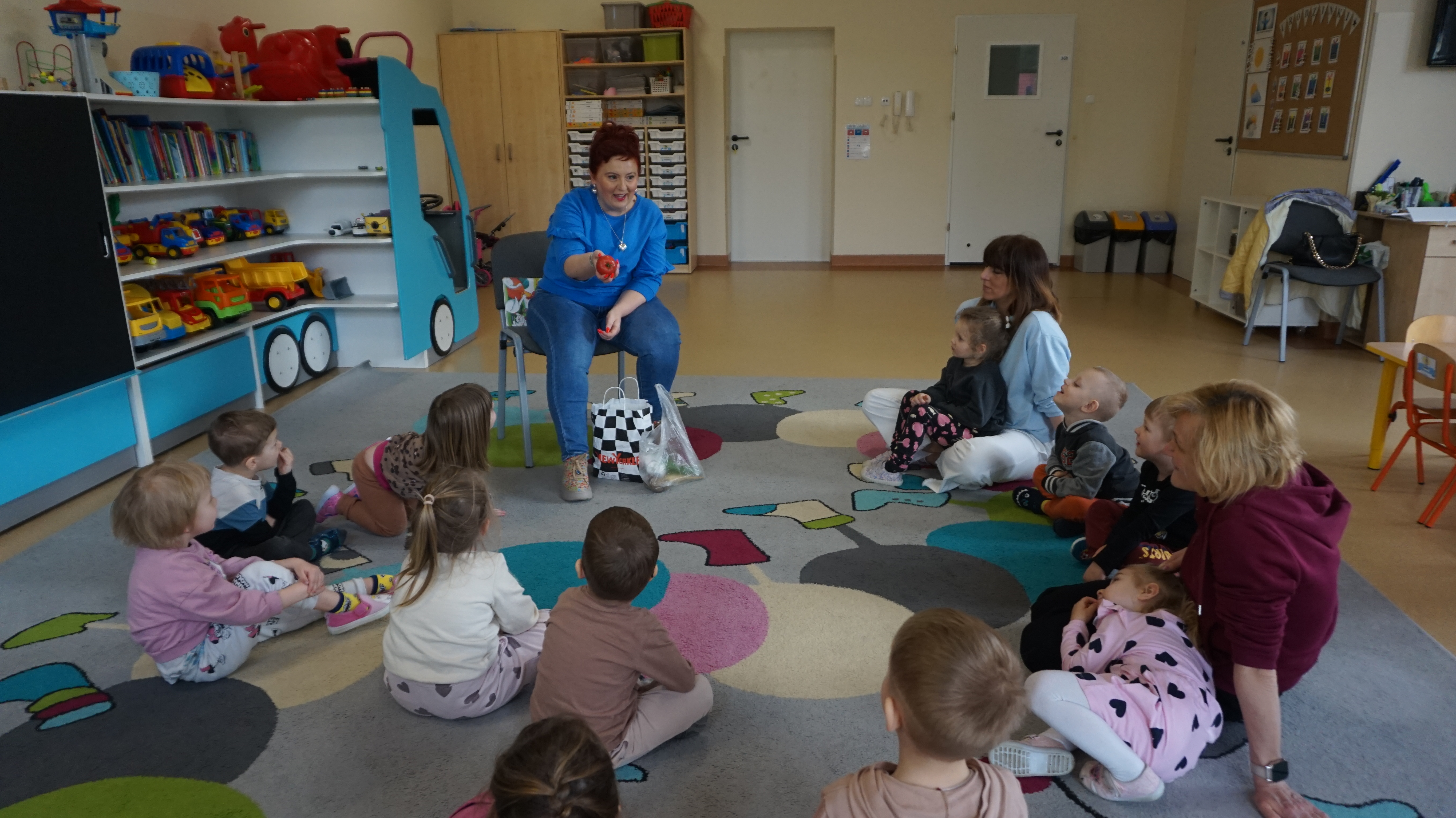 W naszej grupie trzylatków odbyły się zajęcia z udziałem pani z biblioteki pedagogicznej. Spotkanie rozpoczęło się od wysłuchania ciekawej bajki o warzywach, która wprowadziła dzieci w temat zdrowego odżywiania. Następnie przedszkolaki miały okazję poznać różne warzywa wszystkimi zmysłami – mogły je obejrzeć, dotknąć oraz powąchać. Podczas rozmowy dzieci chętnie dzieliły się swoimi spostrzeżeniami i doświadczeniami. Na zakończenie zajęć trzylatki z zaangażowaniem kolorowały obrazki przedstawiające warzywa, utrwalając zdobytą wiedzę. Było to bardzo ciekawe i rozwijające spotkanie, które dostarczyło dzieciom wielu pozytywnych wrażeń.