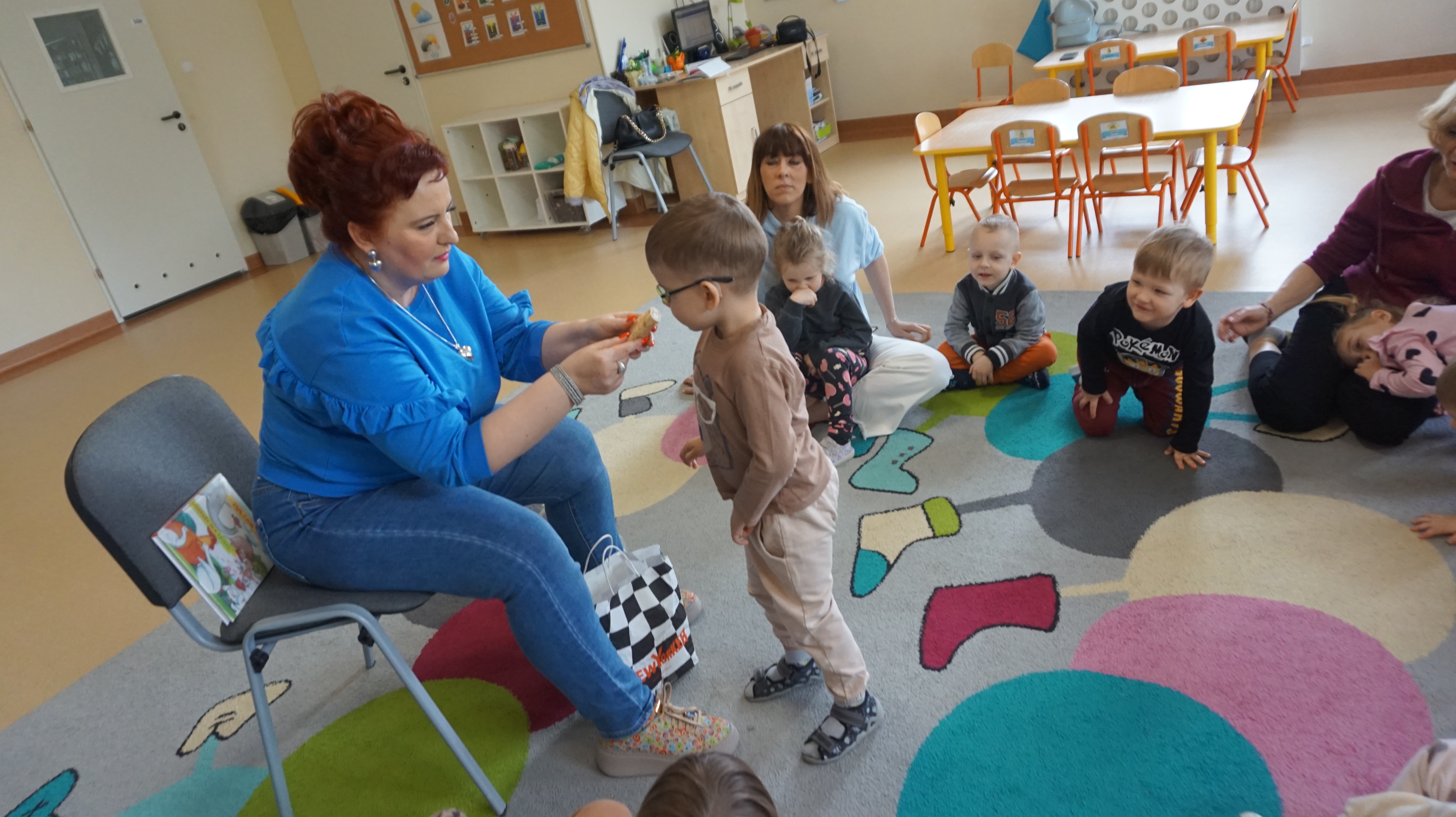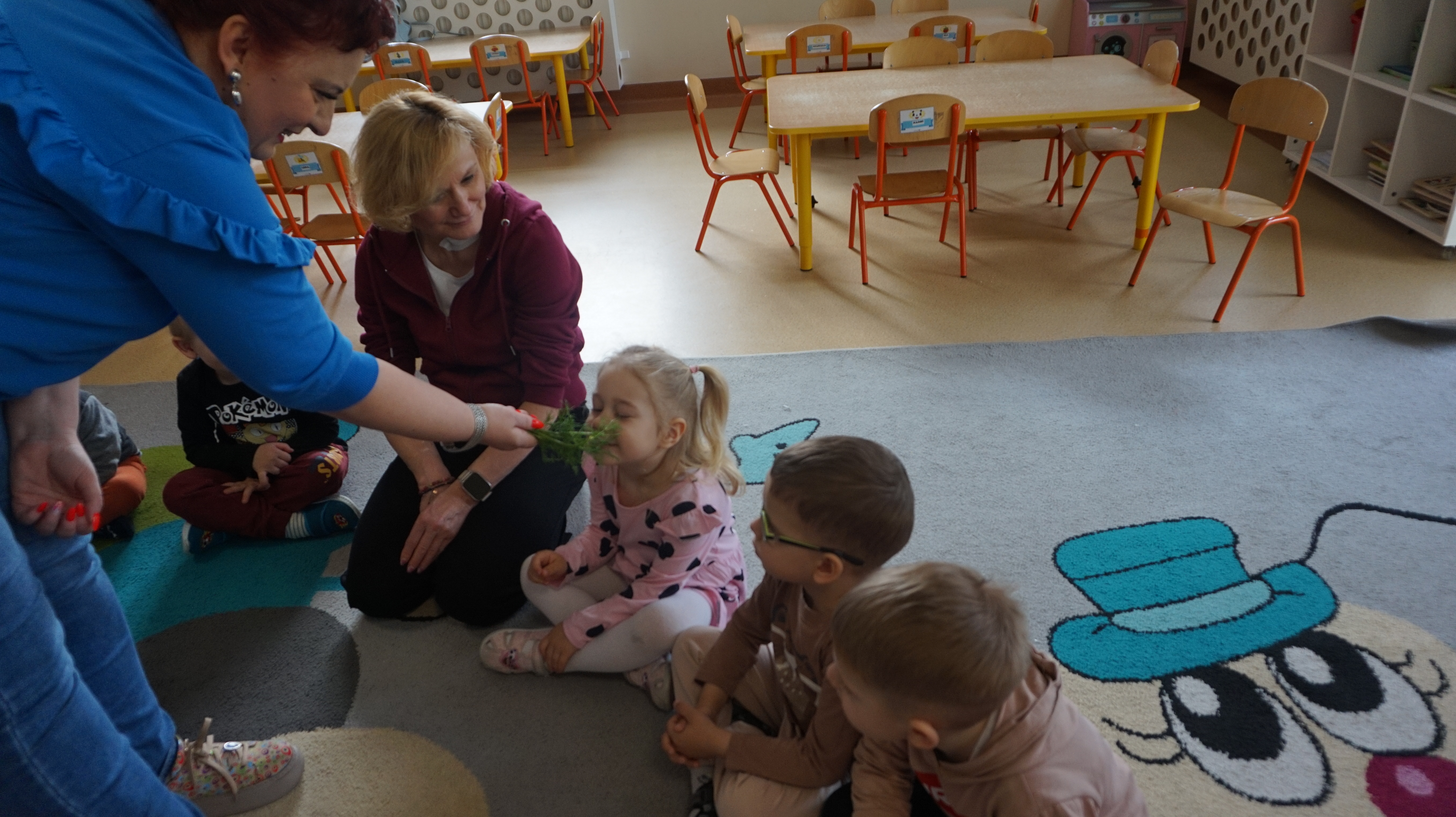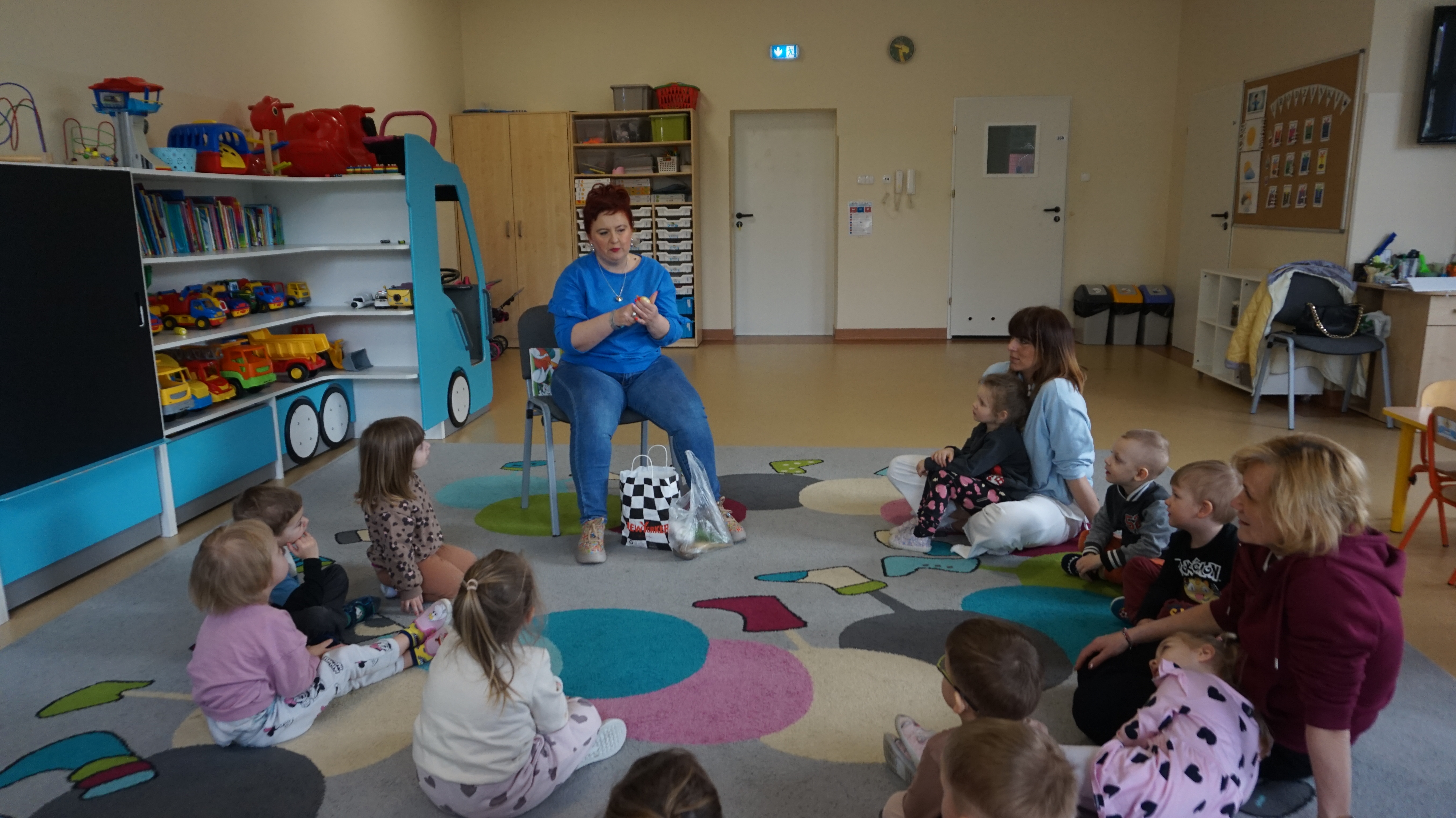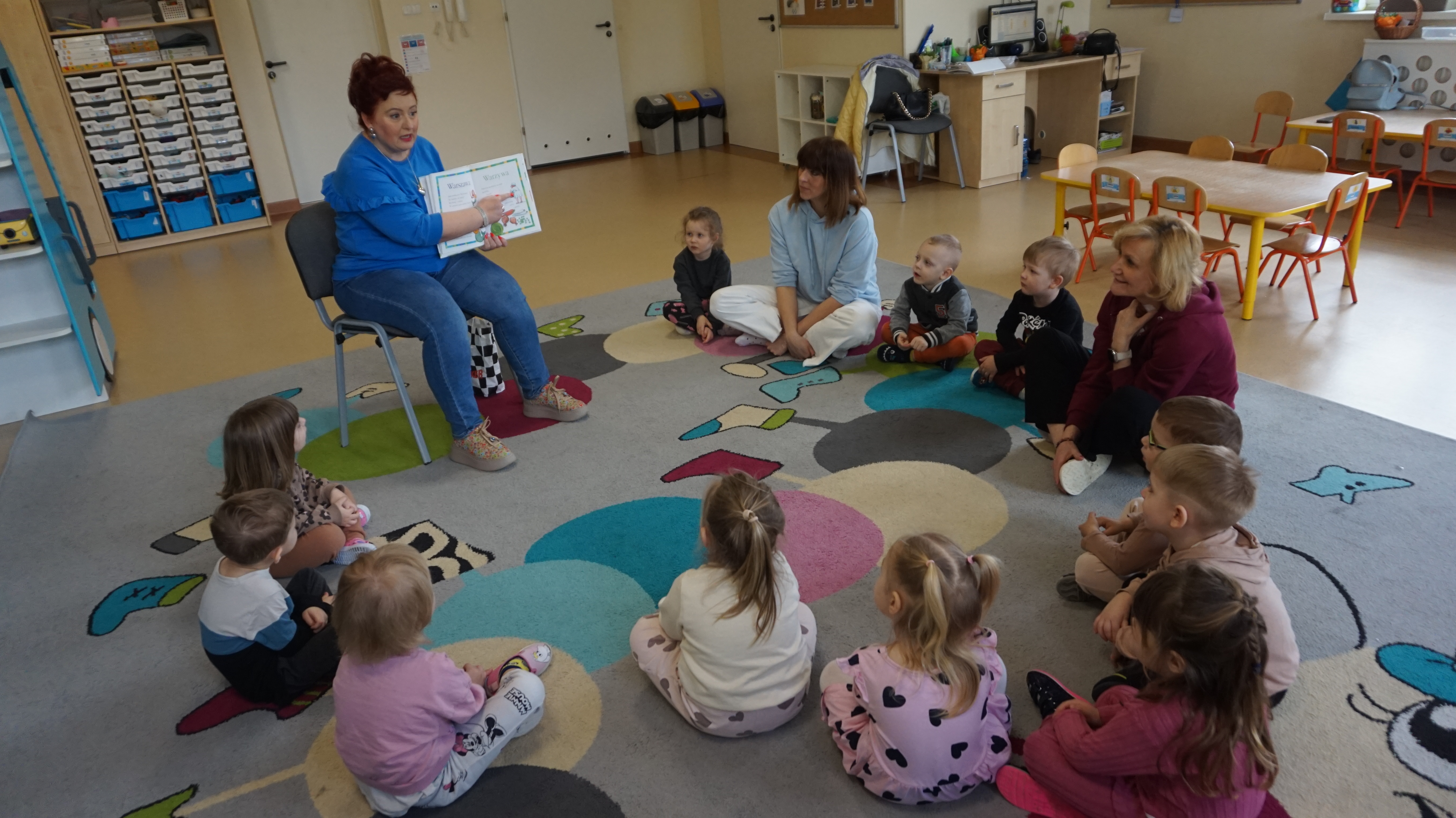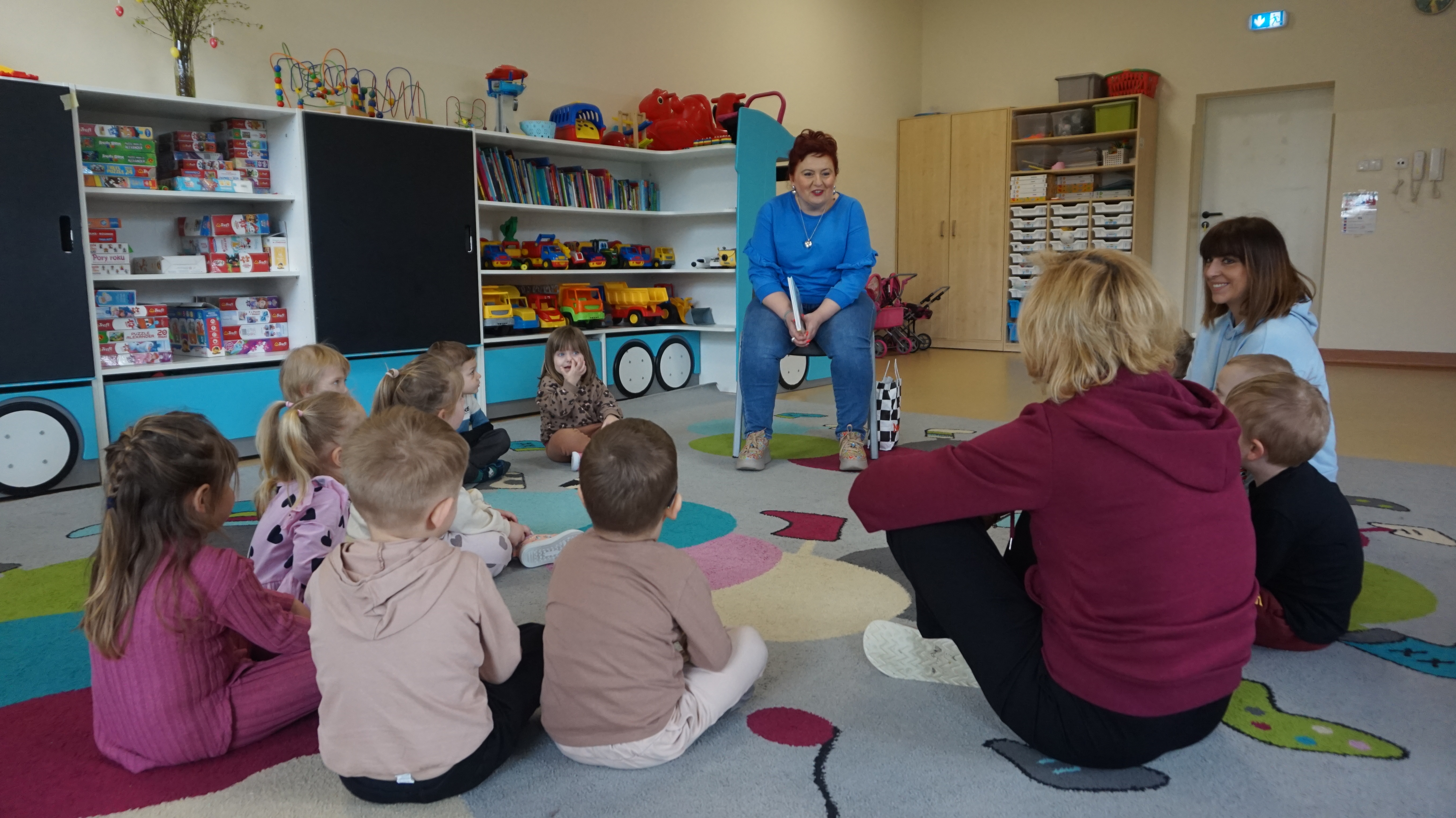 W naszej grupie trzylatków odbyły się zajęcia z udziałem pani z biblioteki pedagogicznej. Spotkanie rozpoczęło się od wysłuchania ciekawej bajki o warzywach, która wprowadziła dzieci w temat zdrowego odżywiania. Następnie przedszkolaki miały okazję poznać różne warzywa wszystkimi zmysłami – mogły je obejrzeć, dotknąć oraz powąchać. Podczas rozmowy dzieci chętnie dzieliły się swoimi spostrzeżeniami i doświadczeniami. Na zakończenie zajęć trzylatki z zaangażowaniem kolorowały obrazki przedstawiające warzywa, utrwalając zdobytą wiedzę. Było to bardzo ciekawe i rozwijające spotkanie, które dostarczyło dzieciom wielu pozytywnych wrażeń.