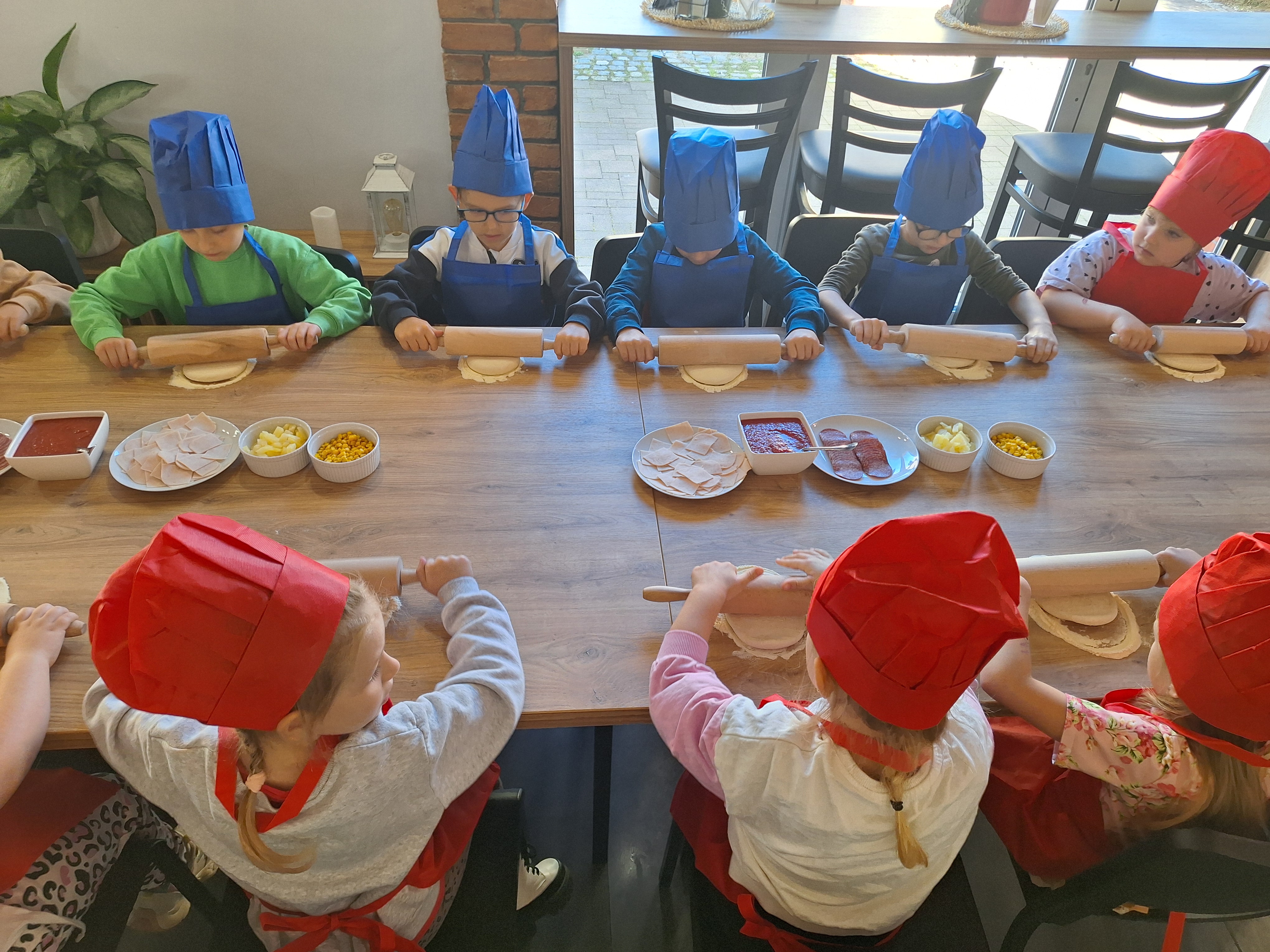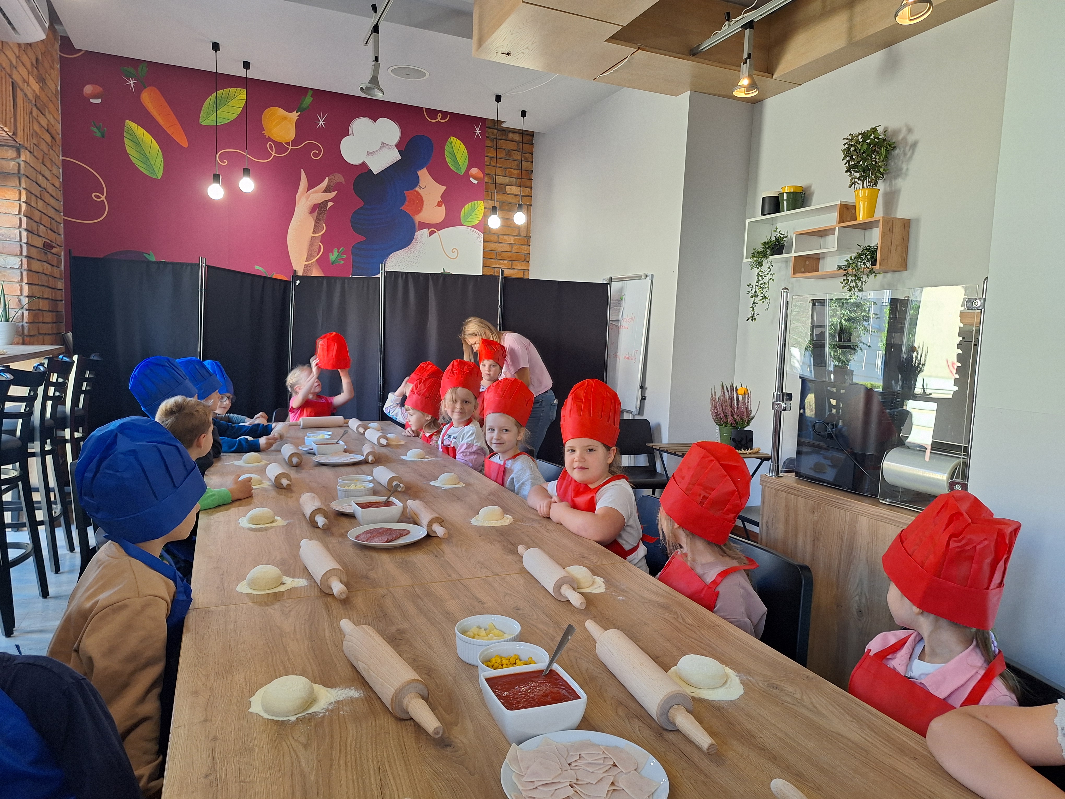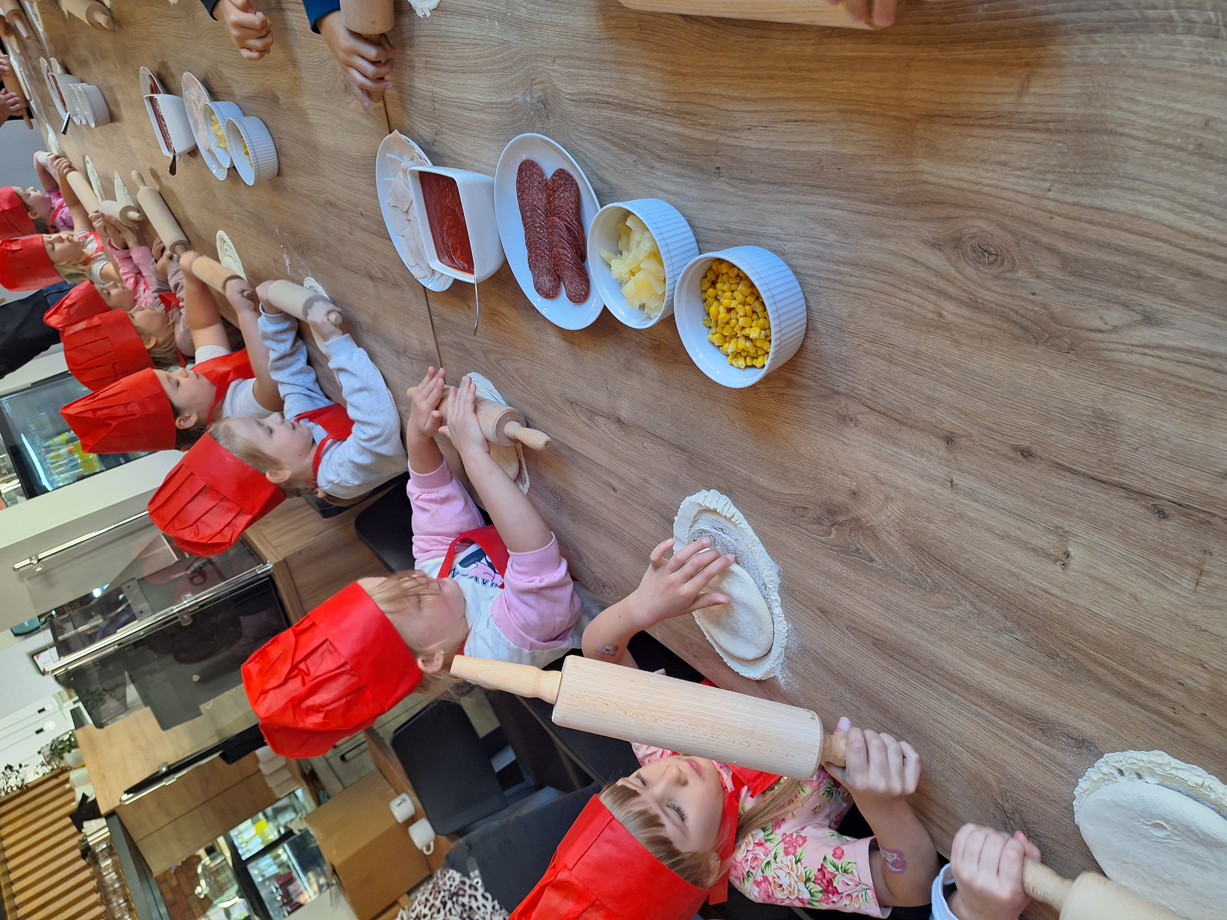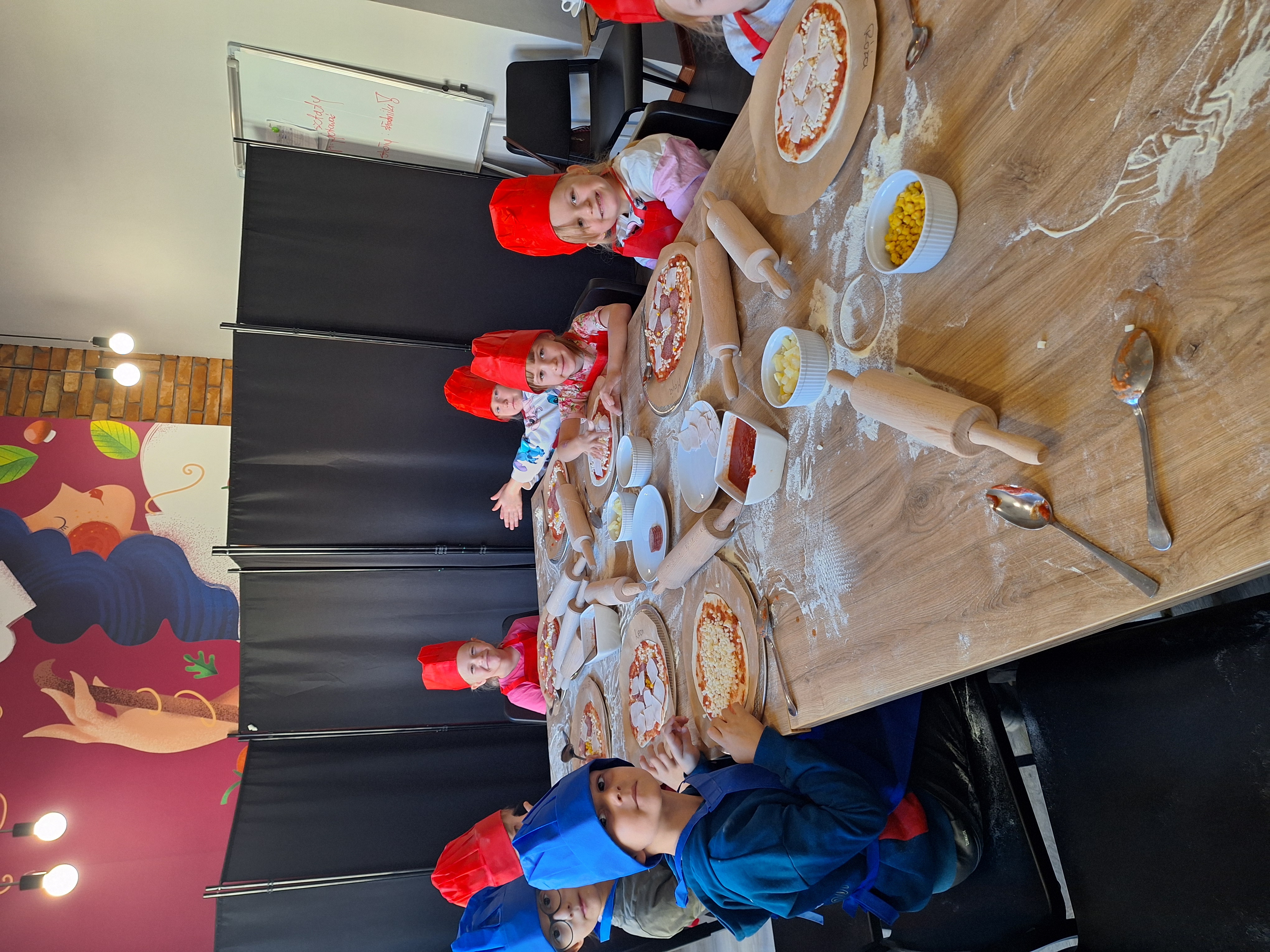 Mali Odkrywcy wzięli udział w warsztatach kulinarnych w restauracji Garmistrz. Dzieci miały okazję samodzielnie przygotować pizzę pod okiem Kucharza, wybierając swoje ulubione składniki i obserwując, jak trafia do pieca. Była to świetna zabawa, pełna radości i smaków!